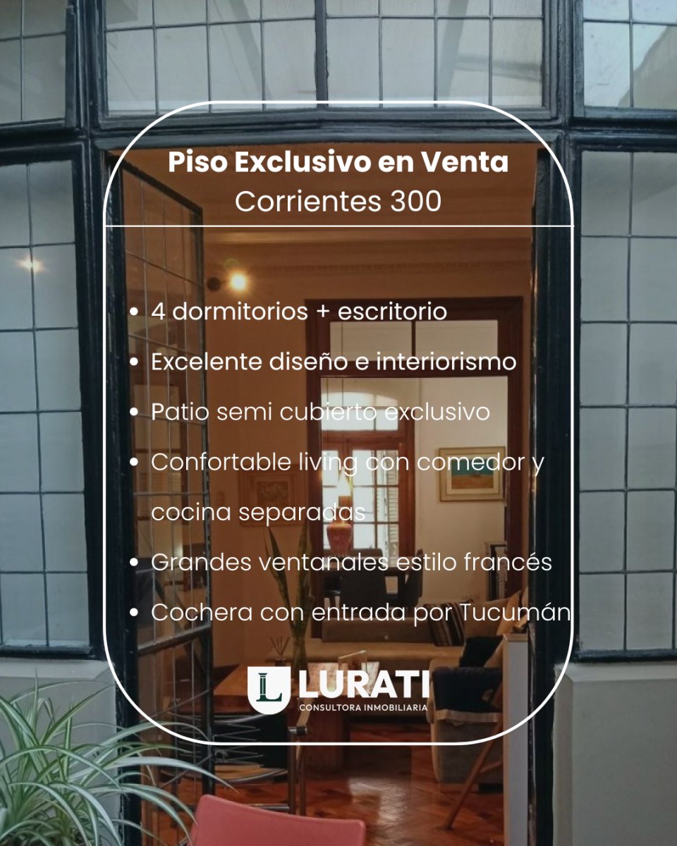 4 dormitorios, escritorio, living comedor, patio con parrillero, 2 baños, 1 toilete, living, comedor, cocina comedor, zona de servicio, vista al frente por Corrientes, cochera por calle Tucumán. Totalmente reciclado con exquisita elegancia y distinción, conservando la nobleza de sus materiales originales en habitaciones del frente, aberturas y alturas, enmarcado en un señorial edificio de 90 años de antigüedad, estilo francés y un departamento por piso. La unidad a la venta, es un departamento, de gran iluminación natural en todos los ambientes, muy buena concepción en su construcción que permite excelente ventilación y doble circulación. (Consultar por privado el piso). Sup total de 224,9868 m2 (8,66 m x 25,98 m). Sup cubierta de la planta 191,67 m2 + Sup no cubierta de uso exclusivo (patio) 28,60 m2. El ingreso es por un palier privado, que da paso a vestíbulo y hall de distribución (de piso cerámico claro e imponentes aberturas originales) que a su vez da acceso al escritorio (de 2.75 x 3 = 8,25 m2) que cuenta con gran biblioteca y ventana al frente; coqueto y luminoso comedor de amplias dimensiones con gran ventanal al frente, amplio living de generosas dimensiones (que se conecta por una zona de paso íntima a los dormitorios y cuenta con una puerta ventana al patio semicubierto de uso exclusivo). Los pisos de escritorio, sala y comedor son parquet y tienen detalles de terminaciones distinguidos. El piso de la zona de circulación interna es de cerámico claro. El patio, que es de uso exclusivo, tiene en parte del techo chapas de policarbonato transparente, para crear una zona reparada en la que hay mesa con sillas para disfrutar esa galería descubierta… más cercano a la zona de cocina está el parrillero de material, con un lugar para compartir ese espacio junto al asador. Todo a lo largo del techo, hay rejas para mayor seguridad interna y evitar la intrusión. Los pisos del patio, son cerámicos, y están sectorizados. Moderna cocina exquisitamente decorada, con mucha zona de guardado en alacenas, barra desayunador, comedor diario, con pisos cerámicos y guardas en madera. Zona de lavado, despensa (o depósito) y habitación de servicio o habitación de planchado con toilete/baño. Amplio pasillo de circulación interna, con zonas de iluminación natural, zonas de guardado, escritorio pequeño y pisos cerámicos claros de gran calidez. 3 dormitorios, de los cuales el principal es en suite y ese baño tiene gran iluminación natural y cálido piso de madera con bañera. Todos cuentan con placares de amplias dimensiones y ventana al patio. Baño completo con ducha y mampara, con iluminación natural. Conexión de gas "readecuado a la nueva normativa". Agua caliente por termotanque. Ventiladores de techo y Calefacción Aire frío - calor. Todos los ambientes con cortinas. Importante: La compra de esta unidad incluye la 1/5 parte indivisa de la unidad del ultimo piso que cuenta con 80 metros aprox. Cochera por calle Tucumán.