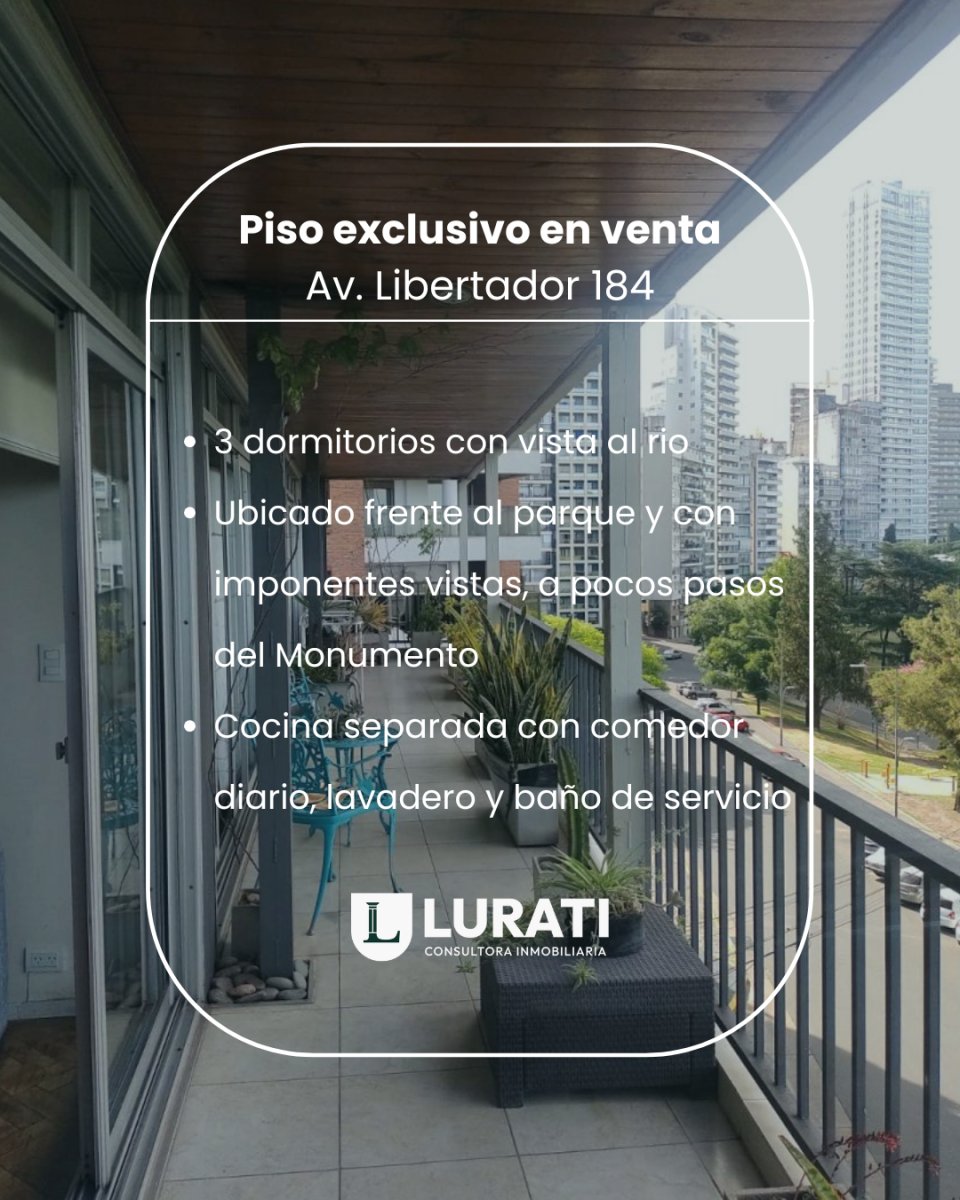 Tu proximo hogar Frente al Paraná... A pasos del Monumento. Piso exclusivo de 3 Dormitorios – con inmejorable vista al río, sobre la copa de los árboles de la barranca del parque. Dirección: Av. Libertad 184 – Rosario Viva en un entorno único, en el mejor lugar del tradicional Barrio Martin, frente al parque y con imponentes vistas al río Paraná, a pocos pasos del Monumento a la Bandera. Este piso exclusivo combina amplitud, luminosidad y una ubicación privilegiada. Al ingresar, se destaca su amplio living-comedor con salida directa a un balcón corrido al frente, ideal para disfrutar de las vistas abiertas. La cocina independiente cuenta con espacio para comedor diario y acceso a lavadero, habitación y baño de servicios. Dispone de tres dormitorios de generosas dimensiones, todos con vista al río con puertas balcón, lo que asegura excelente ventilación, iluminación natural y circulación. Baño completo y toilette de recepción para mayor comodidad. Los pisos de madera aportan calidez y elegancia en cada ambiente. Servicios completos, edificio con gas natural. Cuenta con los siguientes ambientes: balcón corrido a todo el frente, cocina, comedor, comedor diario, lavadero, living, living-comedor, toilette y dependencias de servicio. Comodidades y extras: apto mascotas, elevador principal, apto crédito, vista panorámica al río, y ventilación cruzada. 📍 Ubicación inmejorable: Frente al río, con espacios verdes, atractivos turísticos y todos los servicios que ofrece el mejor lugar de Rosario.